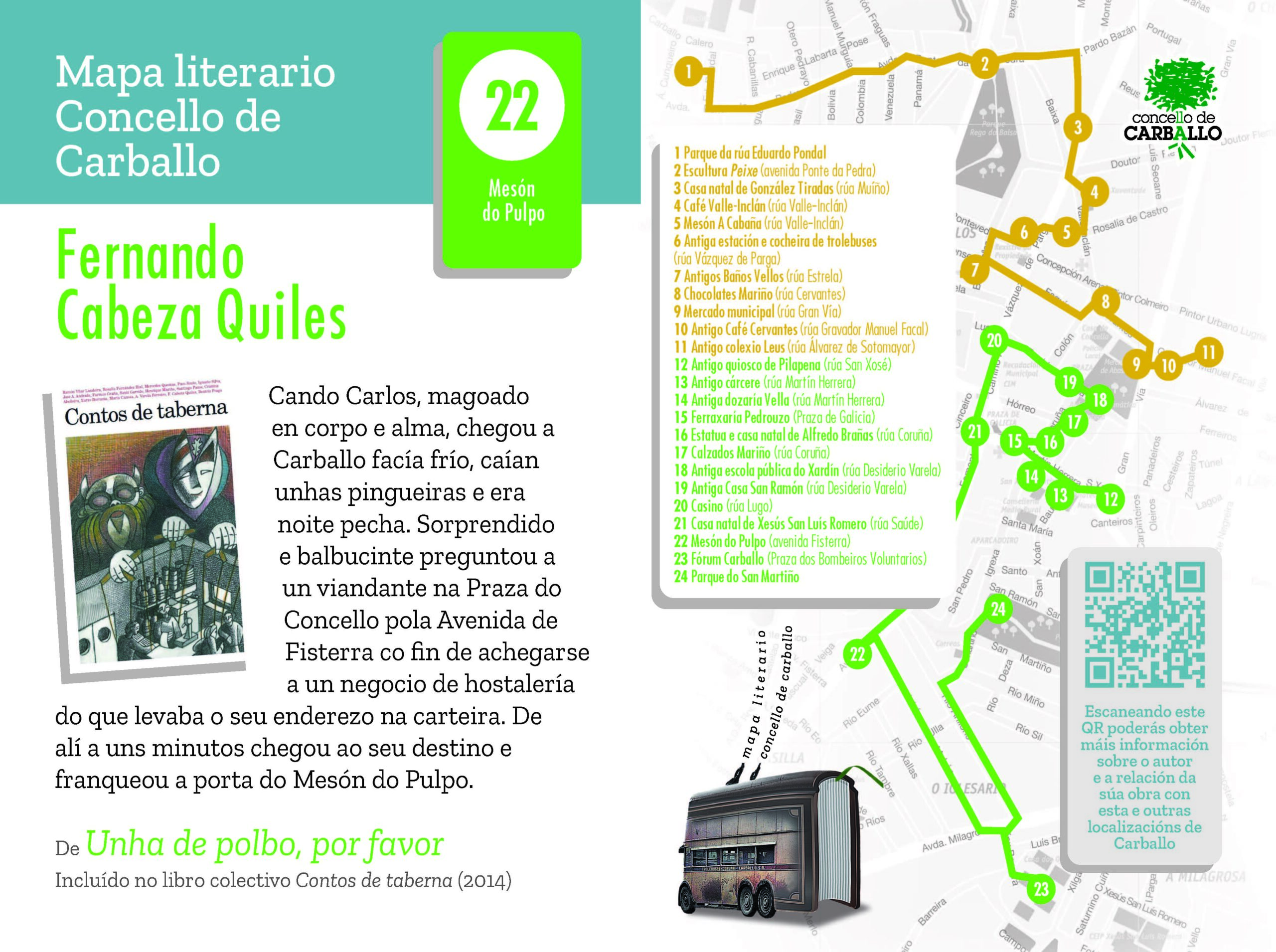 Cando Carlos, magoado en corpo e alma, chegou a Carballo facía frío, caían unhas pingueiras e era noite pecha. Sorprendido e balbucinte preguntou a un viandante na Praza do Concello pola Avenida de Fisterra co fin de achegarse a un negocio de hostalería do que levaba o seu enderezo na carteira. De alí a uns minutos chegou ao seu destino e franqueou a porta do Mesón do Pulpo, un establecemento senlleiro con sona entre o seu dorido visitante cos seus mellores viños e viandas, manxar de deuses; cefalópodo patrio que Carlos Carballeira Barreira tiña interiorizado no seu maxín por telo catado varias veces no restaurante do Centro Galego de Montevideo. Mais, a malleira e o desgusto recibido apenas unha hora antes pecháralle o estómago e a alma a cal e canto e Carlos só acertou a pedir no Mesón do Pulpo, situado no número 23 da Avenida de Fisterra e repleto de bos arrecendos culinarios, unha aséptica tila mesturada cunha manzanilla.