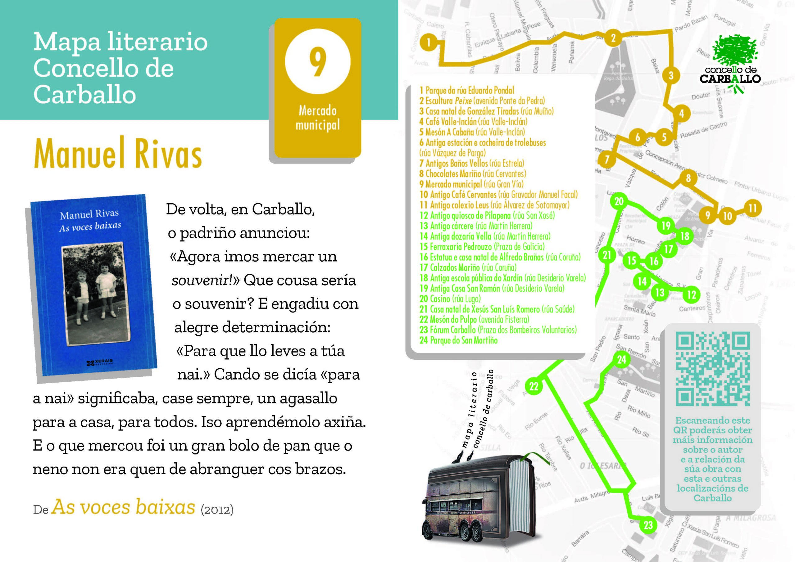 Manuel Rivas (A Coruña, 1957) é un escritor, poeta, ensaísta e xornalista, membro de número da Real Academia Galega desde 2009 e, desde 2011, doutor honoris causa pola Universidade da Coruña. Considerado na actualidade coma o escritor galego con máis proxección internacional, a súa obra, premiada en moi numerosas ocasións, está traducida a vinte idiomas, entre eles o francés, italiano, inglés, alemán, grego, turco, ruso, finés, holandés, croata e xaponés. Licenciado en Ciencias da Información pola Universidade Complutense de Madrid e subdirector do desaparecido Diario de Galicia, colabora adoito en diversos medios de comunicación galegos e españois: El País, El Ideal Gallego ou La Voz de Galicia, entre outros moitos. En 2013 puxo en marcha a revista Luzes canda a Xosé Manuel Pereiro. Membro fundador de Greenpeace, foi tamén un dos máis destacados activistas contra a xestión da catástrofe do Prestige, mesmo como participante na creación da plataforma cidadá Nunca Máis.